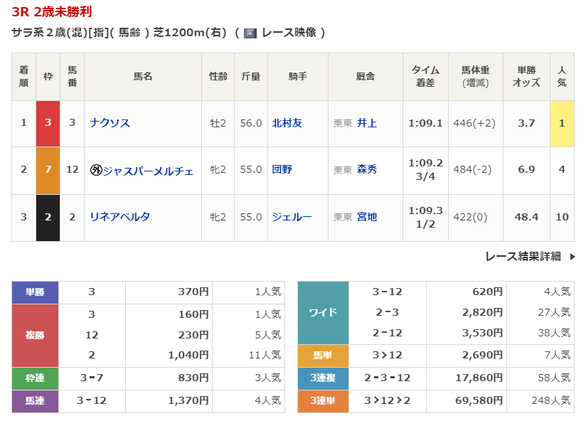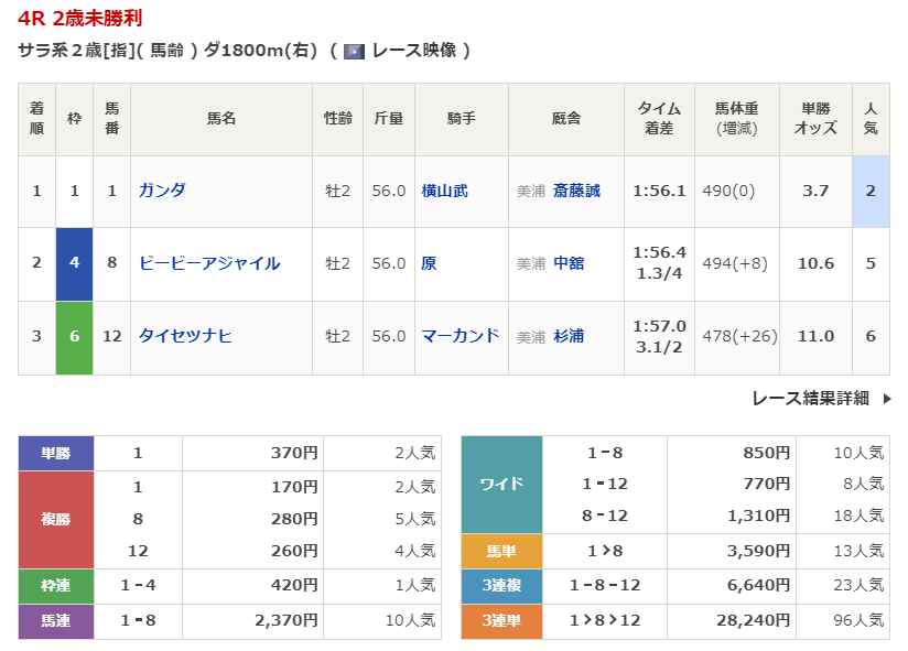 ◎ドナソール(4人気)1着 単勝1,180円、複勝340円 - 12/7【中山2R】2歳未勝利