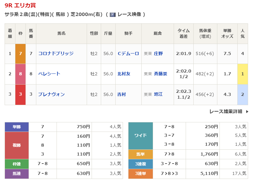 ◎コロナドブリッジ(4人気)1着 単勝750円、複勝160円