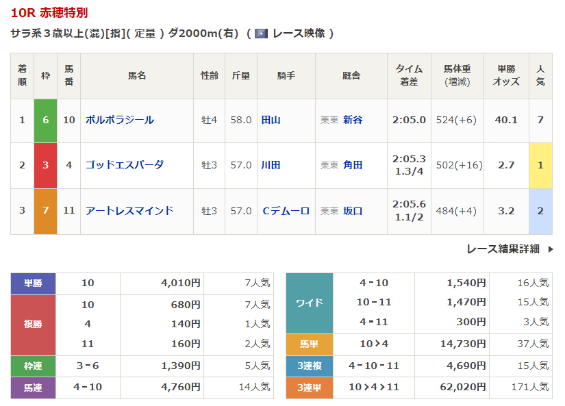 ◎ポルポラジール(7人気)1着 単勝4,010円、複勝680円