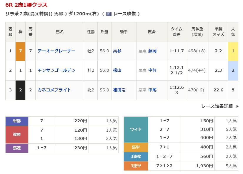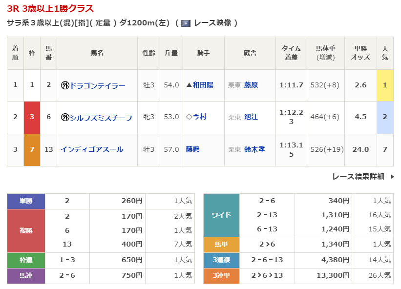 ◎フルドド(6人気)2着 複勝540円 - 12/7【中京8R】3歳以上1勝クラス