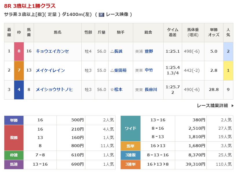 ◎メイショウサトノヒ(9人気)3着 複勝800円