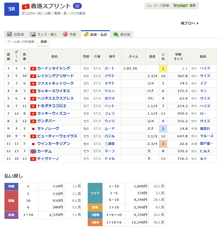 ◎カウンティフェア(10人気)2着 複勝610円 - 12/14【シャティン5R】香港スプリント
