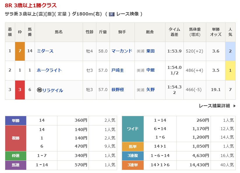 ◎ペイドラロワール(8人気)1着 単勝1,860円、複勝440円 - 12/20【中京9R】クリスマスローズステークス