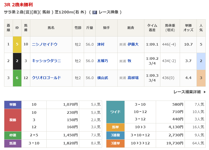 ◎ニシノセイドウ(5人気)1着 単勝1,070円、複勝230円