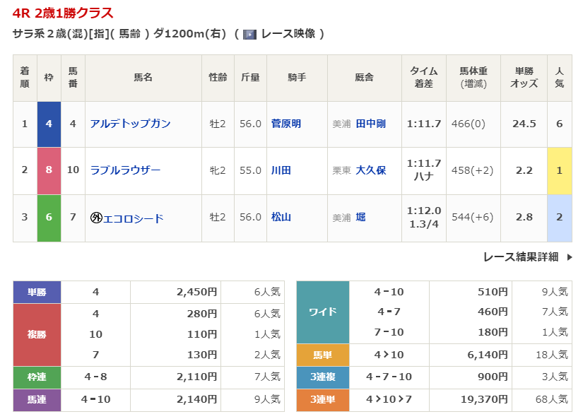 ◎アルデトップガン(6人気)1着 単勝2,450円、複勝280円