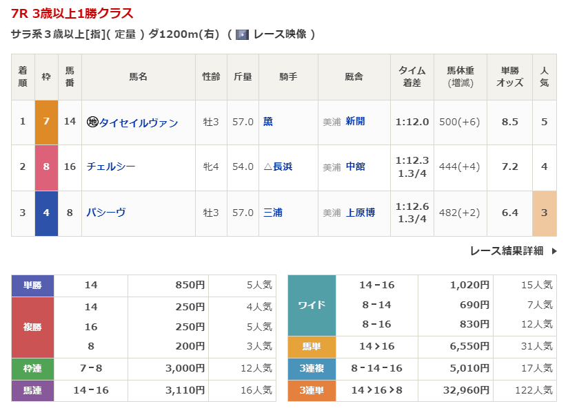 ◎タイセイルヴァン(5人気)1着 単勝850円、複勝250円