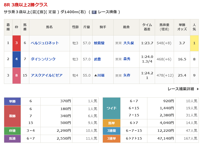 ◎スピナーリート(8人気)1着 単勝2,720円、複勝600円
