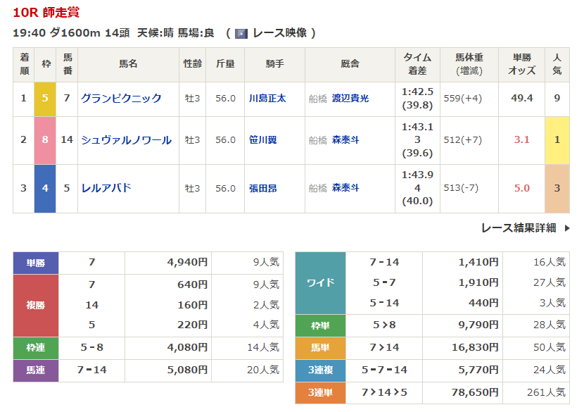 ◎グランピクニック(9人気)1着 単勝4,940円、複勝640円