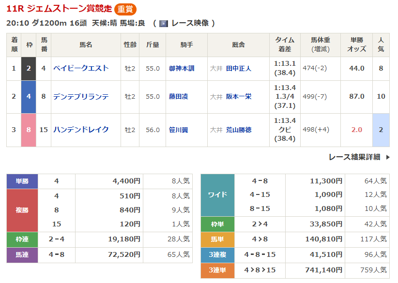 ◎ベイビークエスト(8人気)1着 単勝4,400円、複勝510円