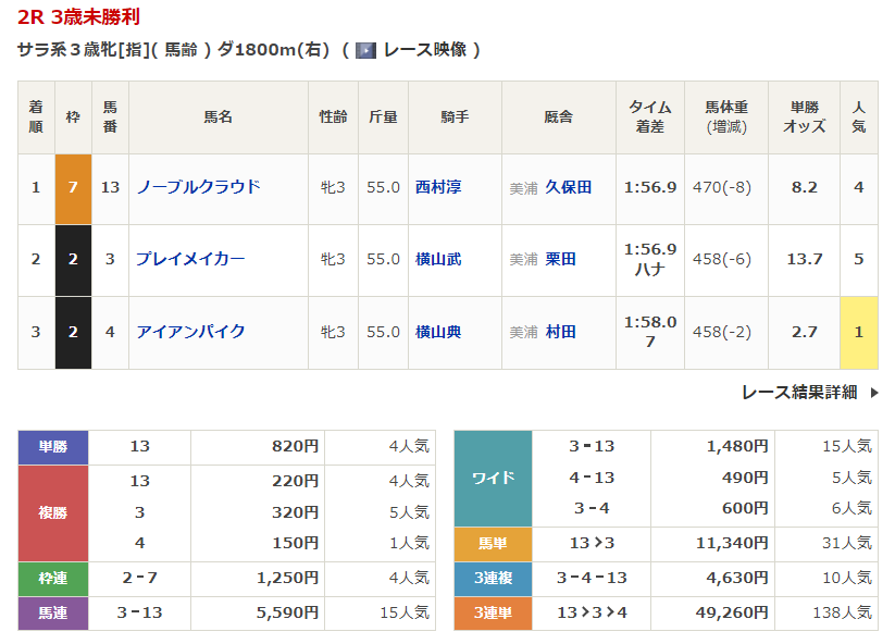 ◎ノーブルクラウド(4人気)1着 単勝820円、複勝220円
