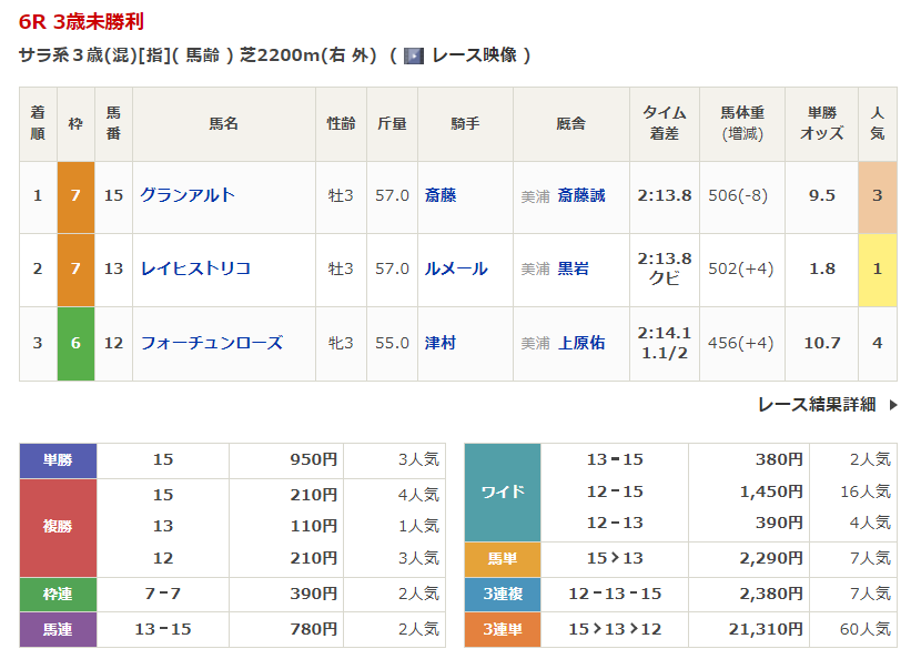 ◎グランアルト(3人気)1着 単勝950円、複勝210円