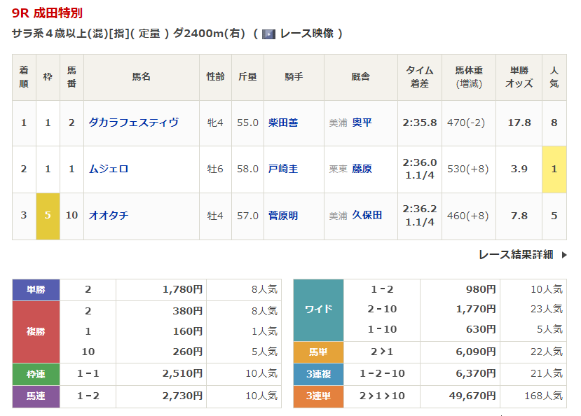 ◎ダカラフェスティヴ(8人気)1着 単勝1,780円、複勝380円