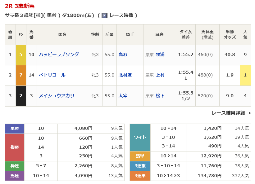 1/11 京都2R 3歳新馬 ダート1800m 波乱度C