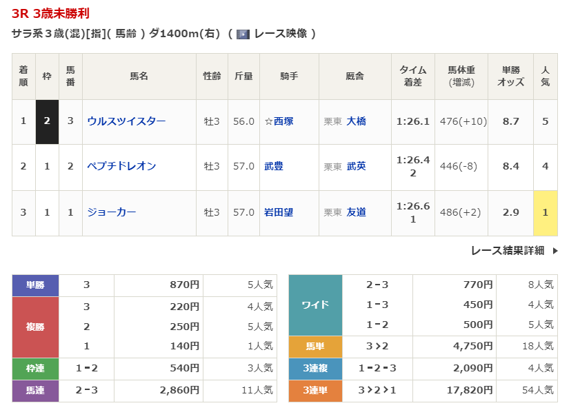 ◎ウルスツイスター(5人気)1着 単勝870円、複勝220円