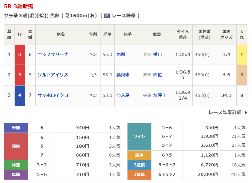 ◎ニシノイツキムスメ(6人気)3着 複勝320円 - 1/10【中山4R】3歳新馬