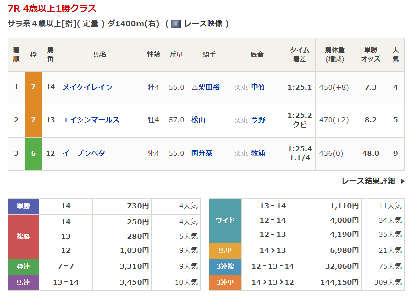 ◎メイショウテンク(4人気)2着 複勝220円