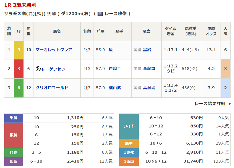 ◎マーガレットクレア(6人気)1着 単勝1,310円、複勝250円