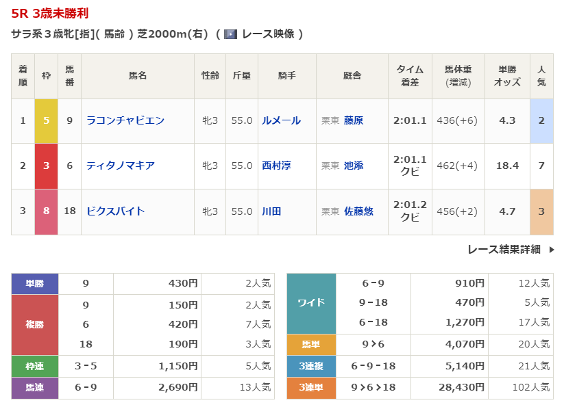 ◎リッキースタイル(6人気)3着 複勝340円 - 1/5【京都2R】3歳未勝利