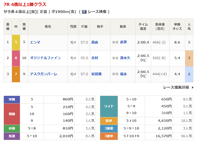 ◎エンマ(5人気)1着 単勝860円、複勝210円