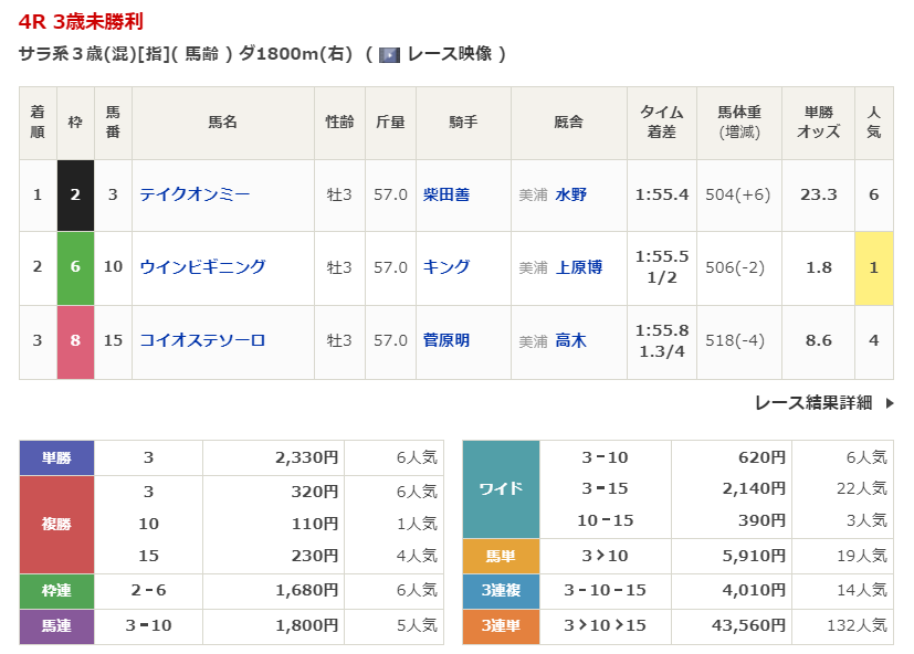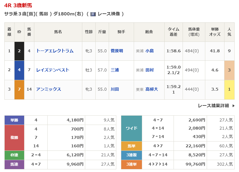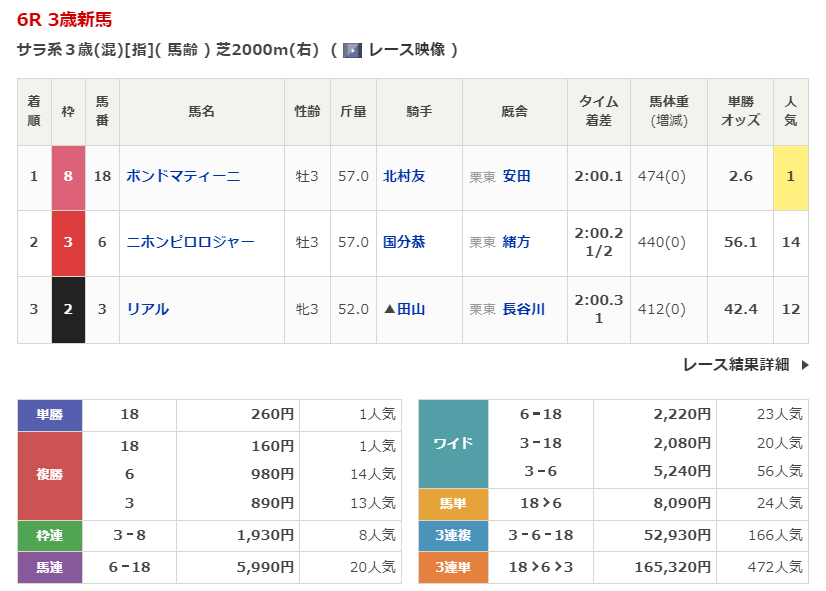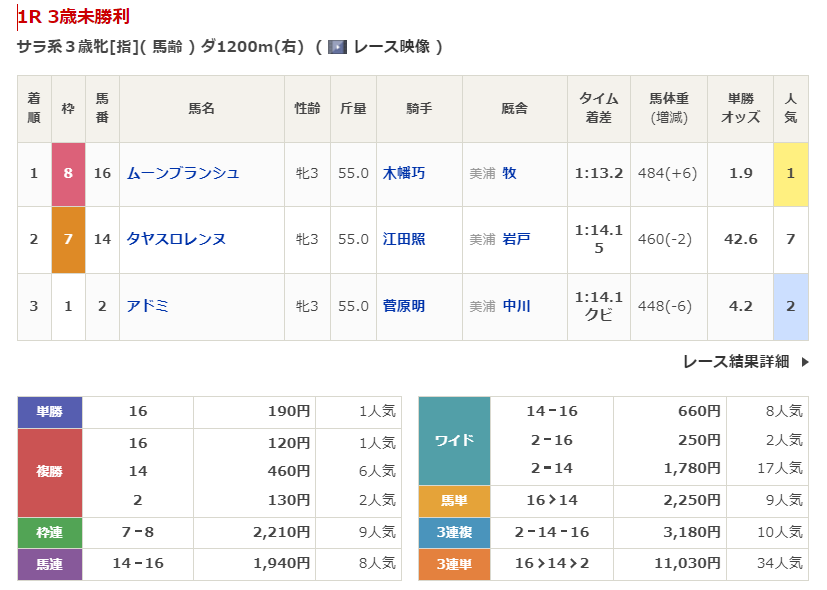 ◎ショウナンアデイブ(18人気)3着 複勝2,710円 - 1/5【中山1R】3歳未勝利