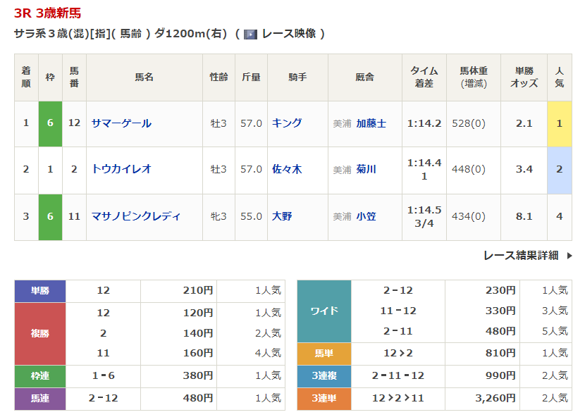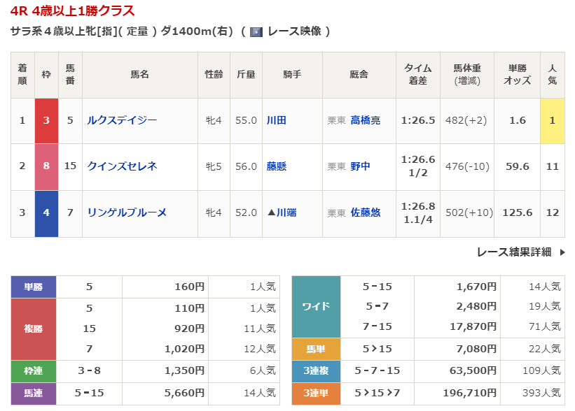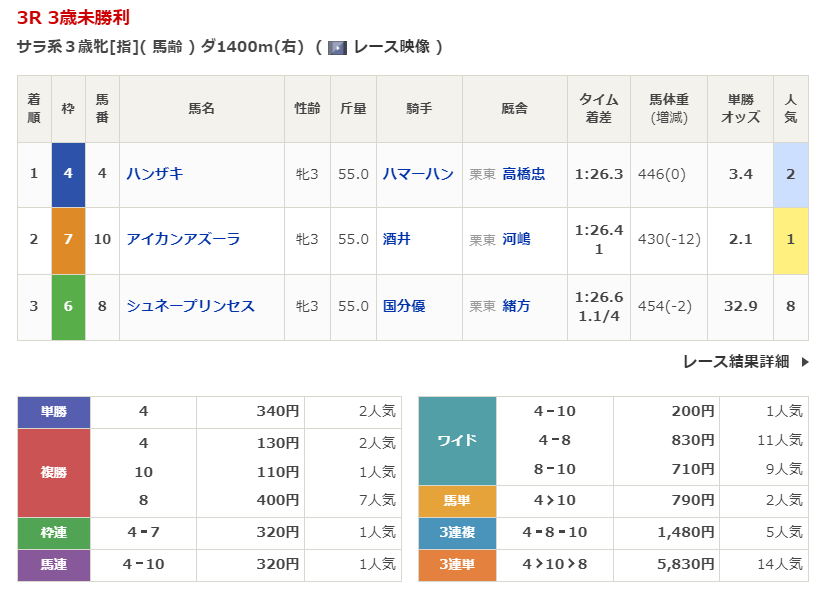 ◎マサノピンクレディ(4人気)3着 複勝160円