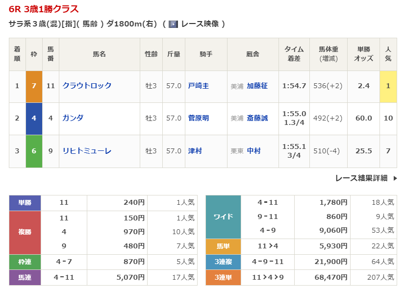 ◎ガーヴィ(6人気)1着 単勝1,380円、複勝390円