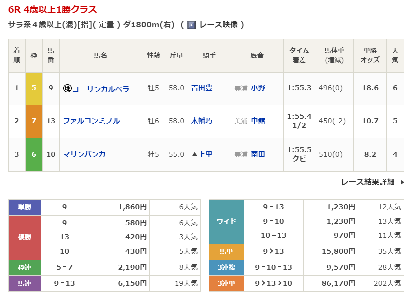 ◎コーリンカルベラ(6人気)1着 単勝1,860円、複勝580円