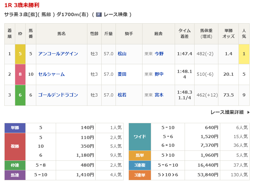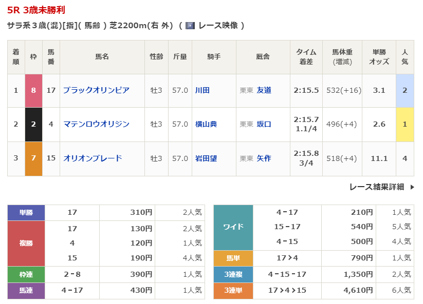 ◎リッキースタイル(6人気)3着 複勝340円 - 1/5【京都2R】3歳未勝利