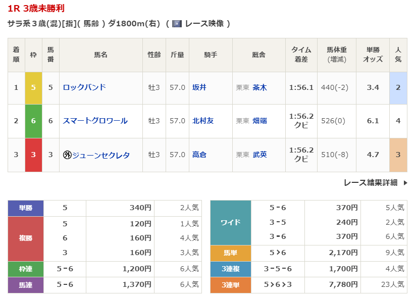 ◎ヒットアンドロール(6人気)1着 単勝2,070円、複勝360円 - 1/12【中山5R】3歳新馬