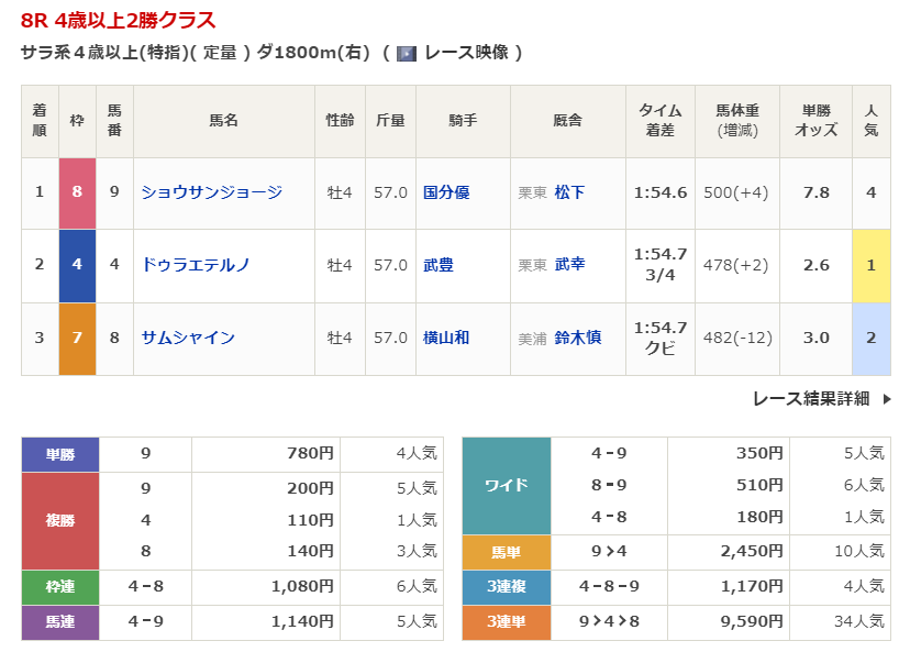 ◎ショウサンジョージ(4人気)1着 単勝780円、複勝200円