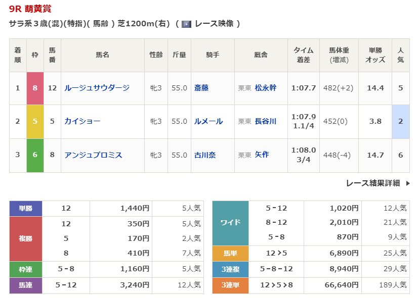 ◎ルージュサウダージ(5人気)1着 単勝1,440円、複勝350円