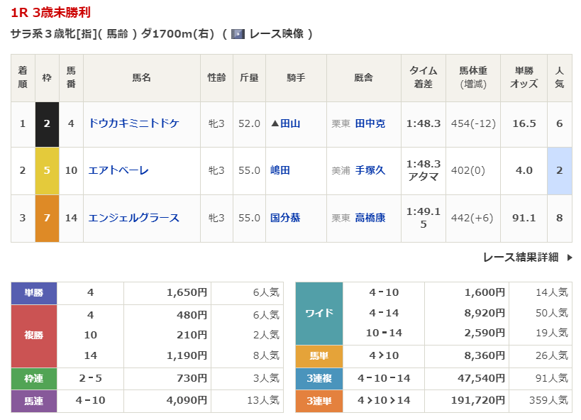 ◎ドウカキミニトドケ(6人気)1着 単勝1,650円、複勝480円