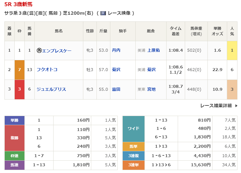 ◎ホウオウプレミア(5人気)2着 複勝360円