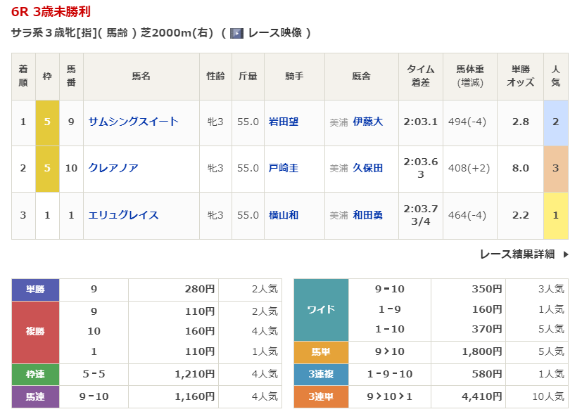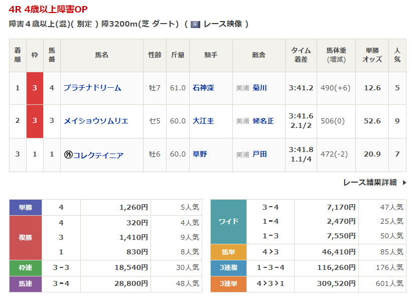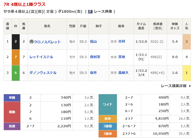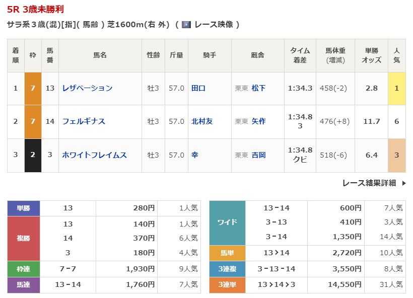 ◎ホワイトフレイムス(3人気)3着 複勝180円