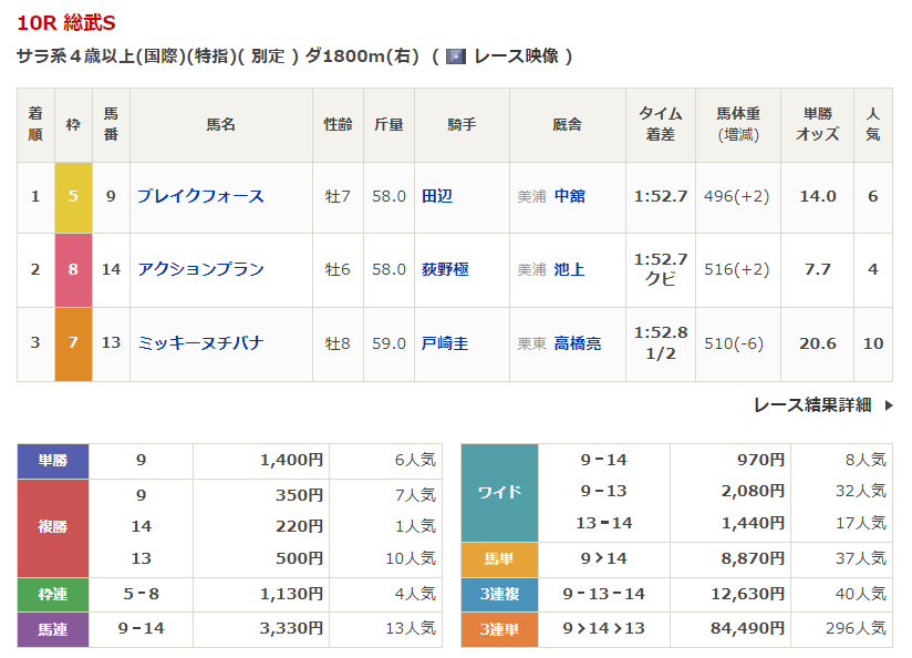 ◎ブレイクフォース(6人気)1着 単勝1,400円、複勝350円