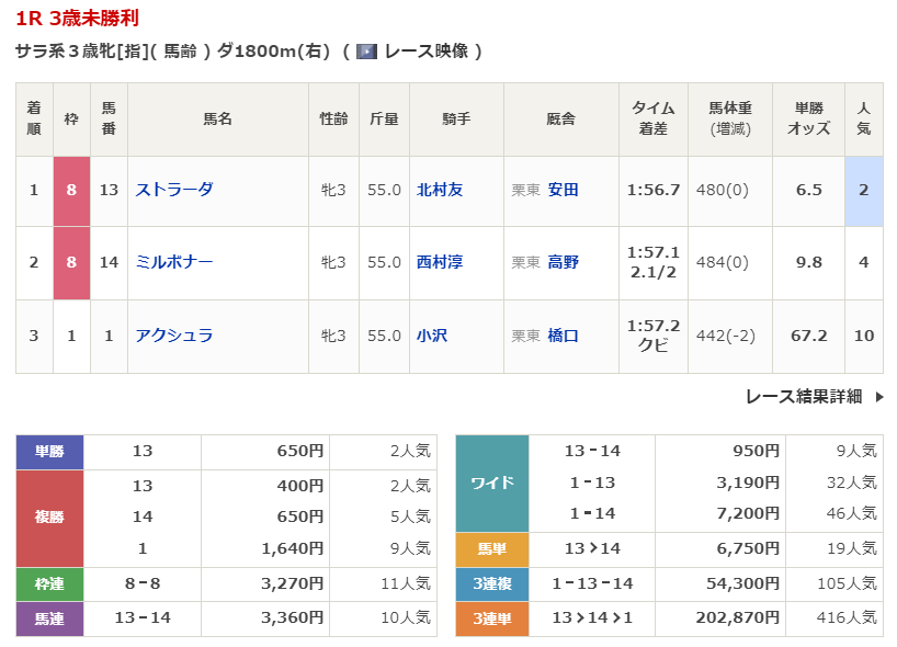 このレースでは穴馬の◎ミルボナー(4番人気)2着、◎アクシュラ(10番人気)3着と穴馬がダブルで好走。1着には相手馬の★ストラーダ(2番人気)が入りましたが、1番人気の馬が圏外になったことで穴馬同士のワイドは7,200円、3連複は54,300円、3連単は202,870円と高額配当に繋がりました。