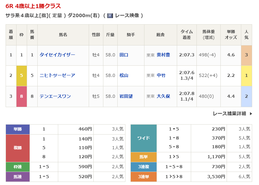 ◎タイセイカイザー(3人気)1着 単勝460円、複勝140円