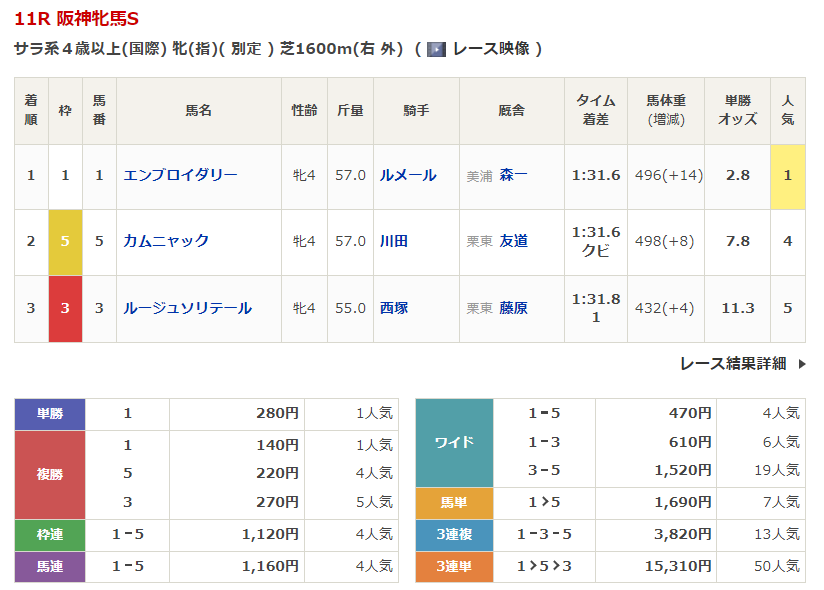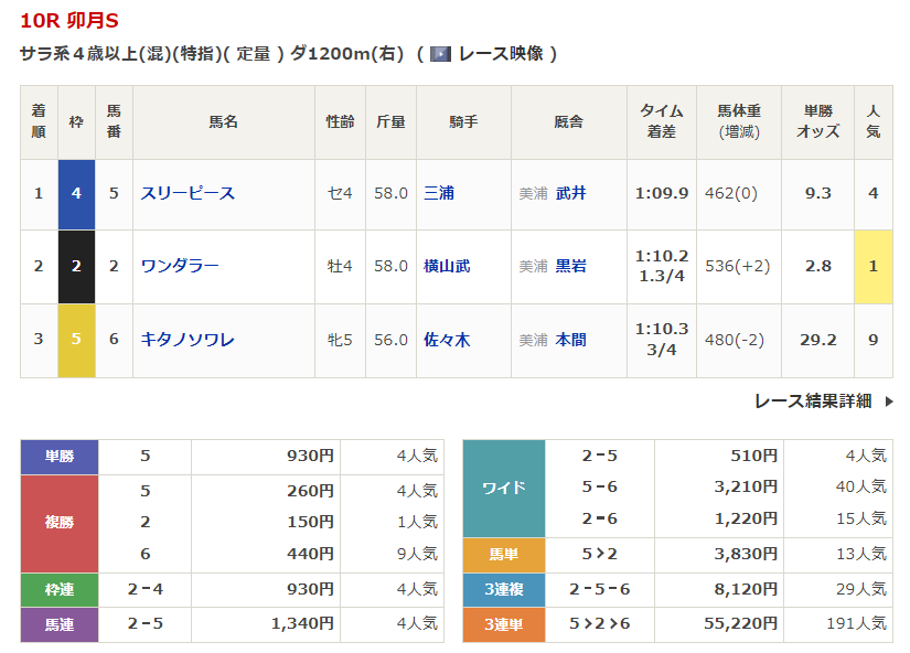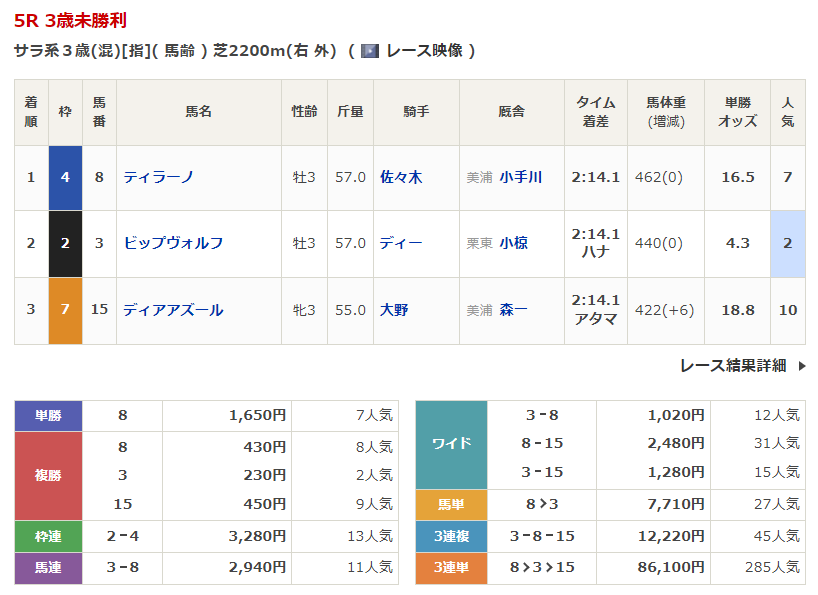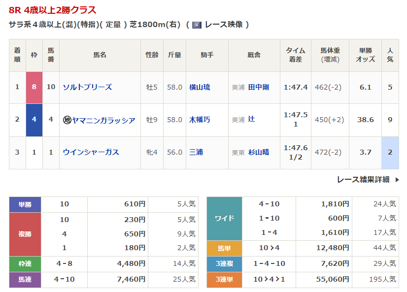 ◎ソルトブリーズ(5人気)1着 単勝610円、複勝230円