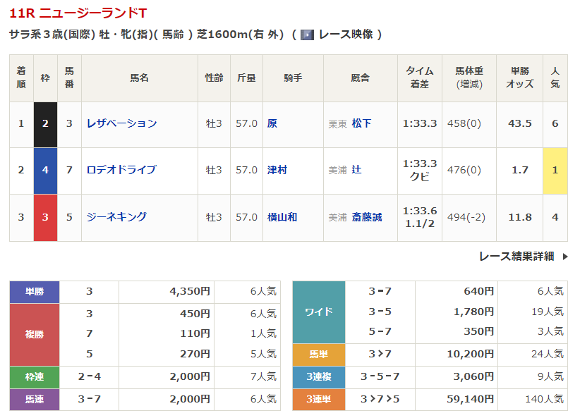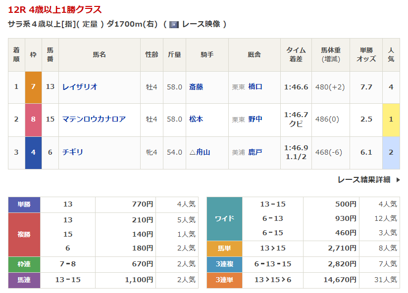 ◎レイザリオ(4人気)1着 単勝770円、複勝210円
