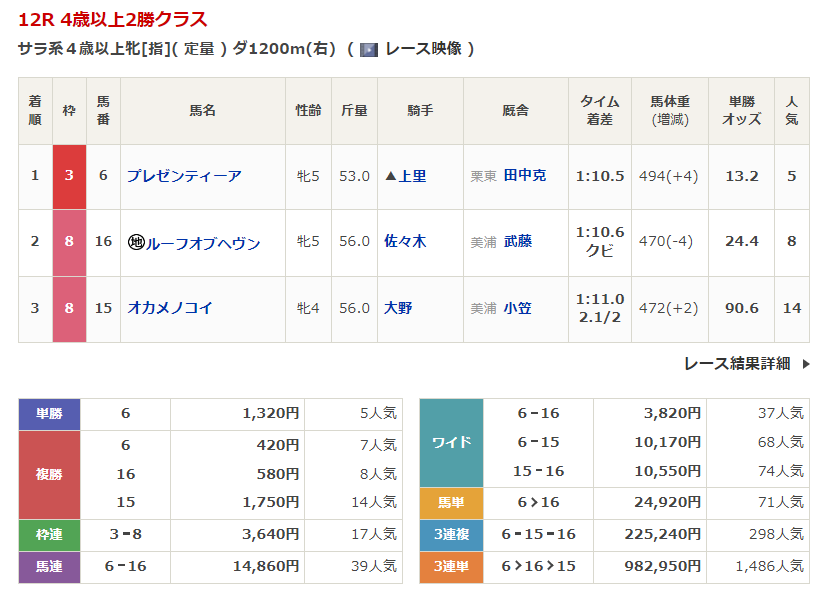 ◎プレゼンティーア(5人気)1着 単勝1,320円、複勝420円