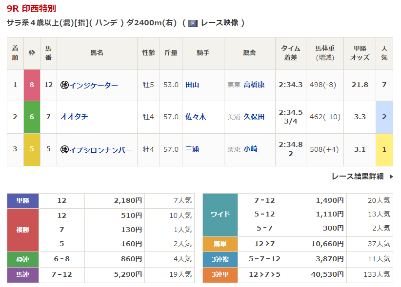 ◎インジケーター(7人気)1着 単勝2,180円、複勝510円