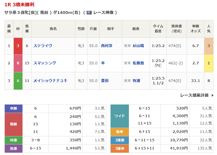 ◎ステライヴ(3人気)1着 単勝670円、複勝240円