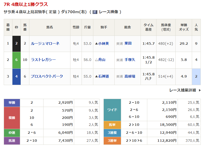 ◎ルージュマローネ(9人気)1着 単勝2,920円、複勝570円