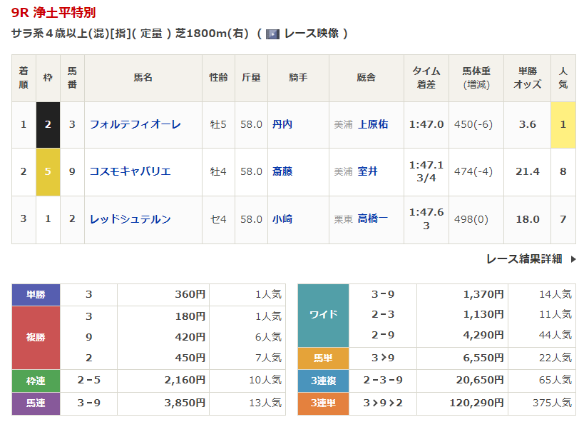 このレースでは穴馬の◎タイセイブルーム(6番人気)が1着に好走してくれました。2着には★エコロボルト(2番人気)、3着には★トラスティア(1番人気)と相手馬がそれぞれ入りましたが3連単は75,850円の配当となりました。
