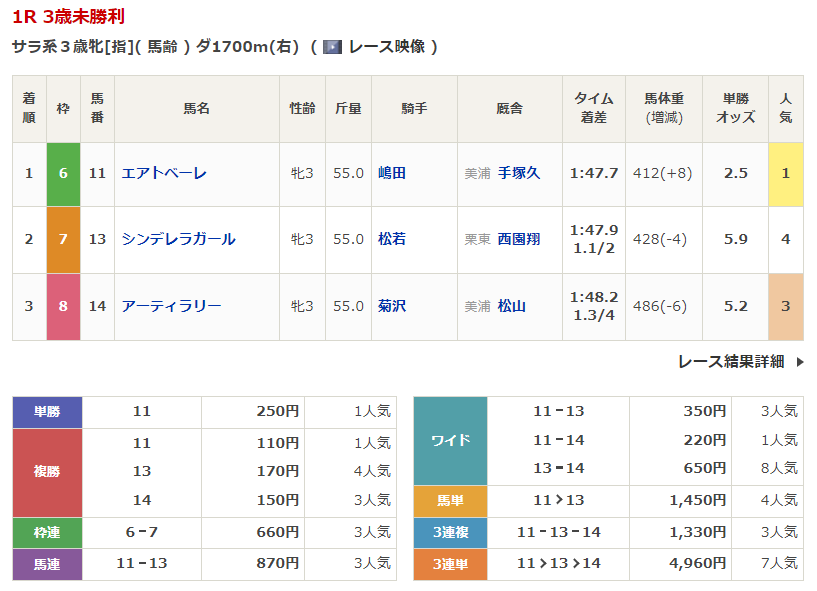 ◎ジーティーアリア(8人気)1着 単勝1,710円、複勝530円 - 4/5【阪神4R】3歳未勝利