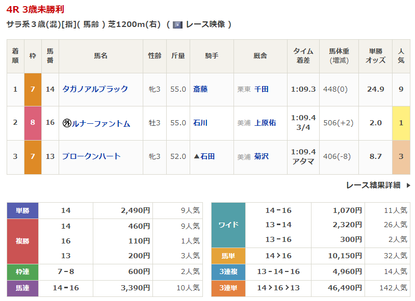 ◎タガノアルブラック(9人気)1着 単勝2,490円、複勝460円
