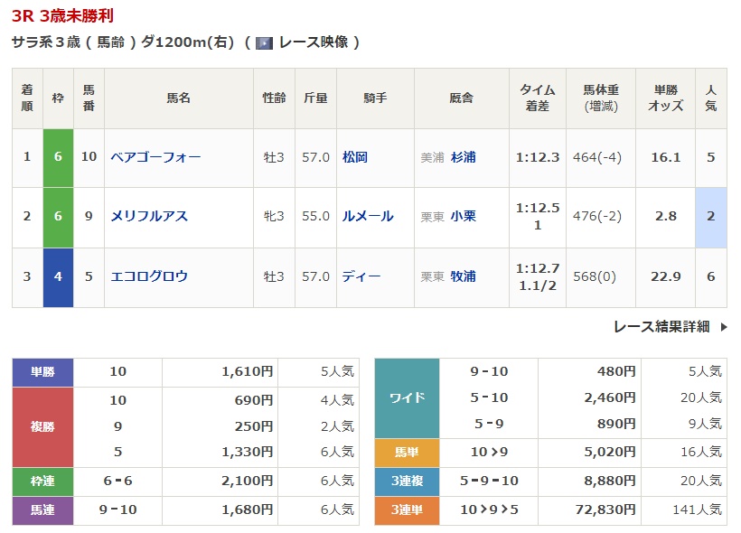 ◎ベアゴーフォー(5人気)1着 単勝1,610円、複勝690円