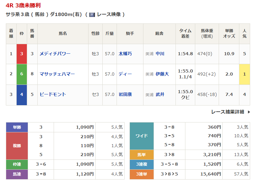 ◎メディチパワー(6人気)2着 複勝260円 - 4/4【中山7R】4歳以上1勝クラス