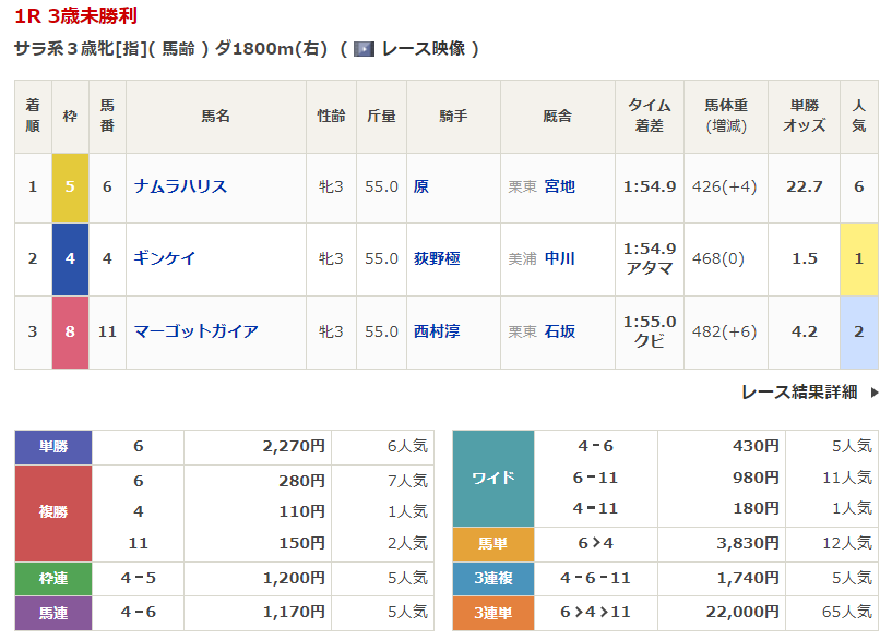 ◎ナムラハリス(6人気)1着 単勝2,270円、複勝280円
