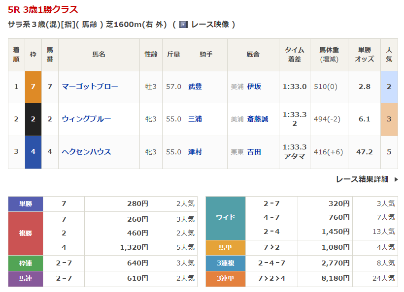 ◎ウィングブルー(3人気)2着 複勝460円